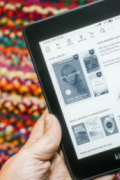 保存一棵树:阅读一本电子书!负担得起的 电子书阅读器 可能是您生活中贪婪的读者的完美礼物-读书爱好者,他的床头柜上有精装书,客厅里 ...